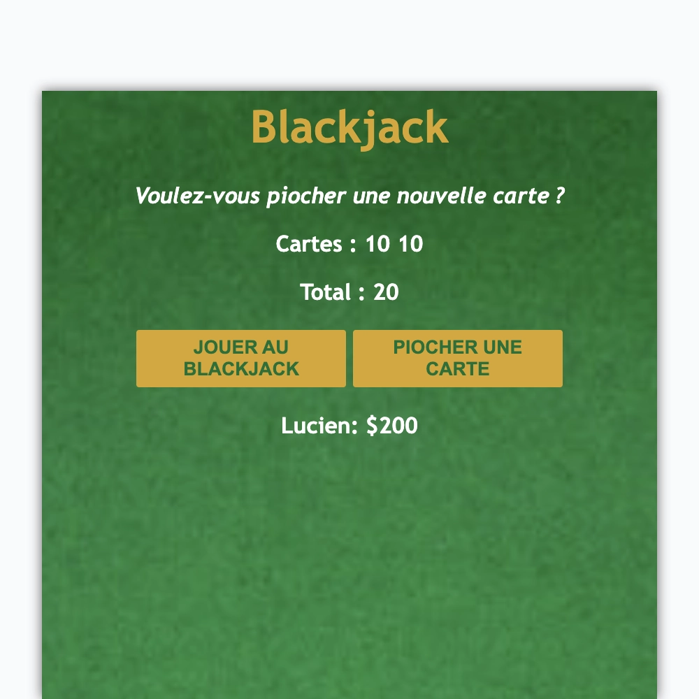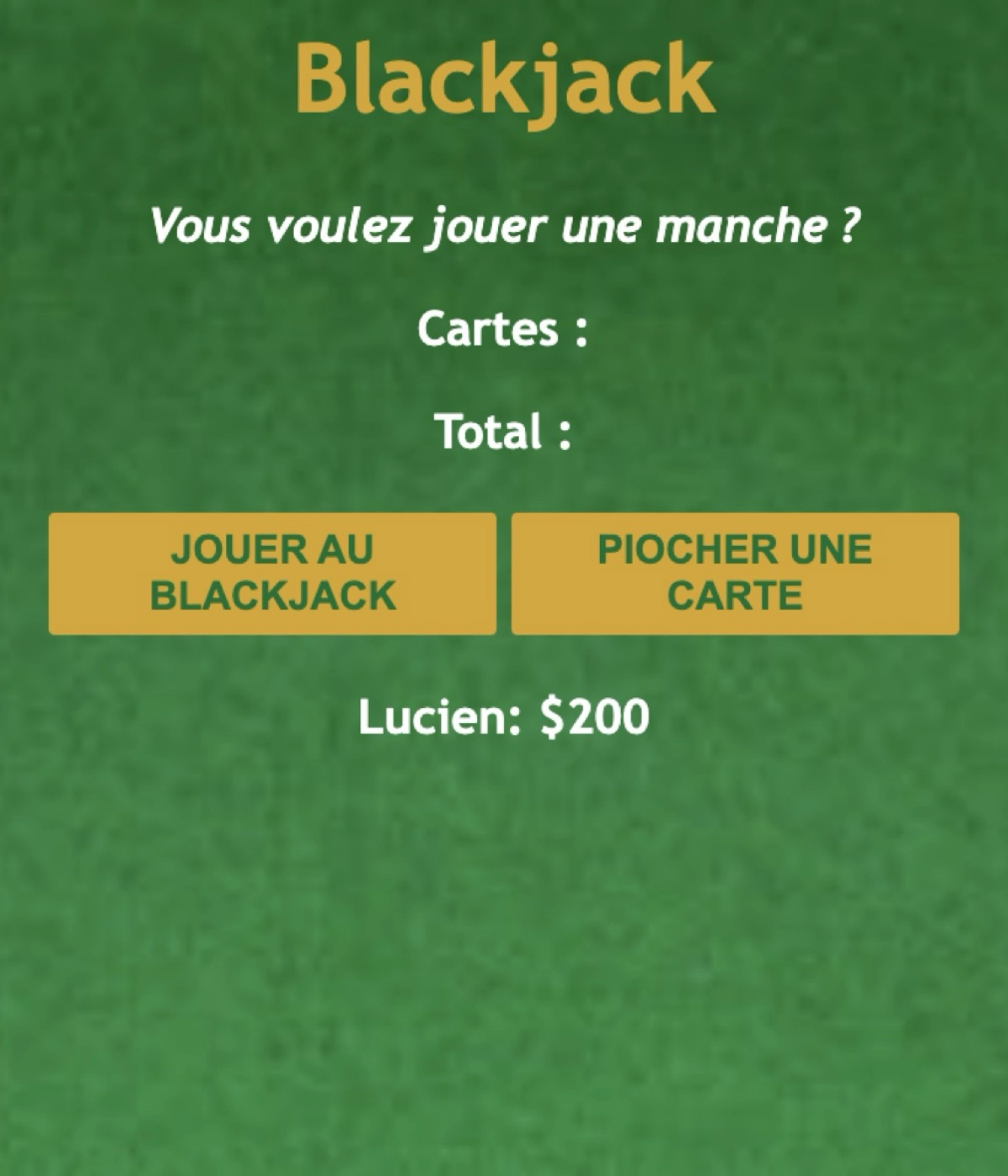 C'est mon premier projet destiné à l'apprentissage de JavaScript. À l'aide de la plateforme d'apprentissage Scrimba, j'ai pu créer ce blackjack, un jeu que j'affectionne par sa simplicité et son ambiance de jeu de saloon.