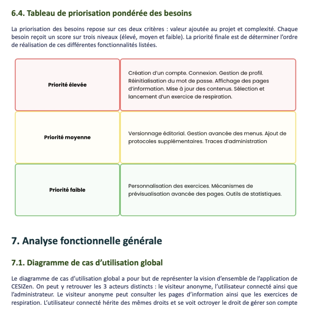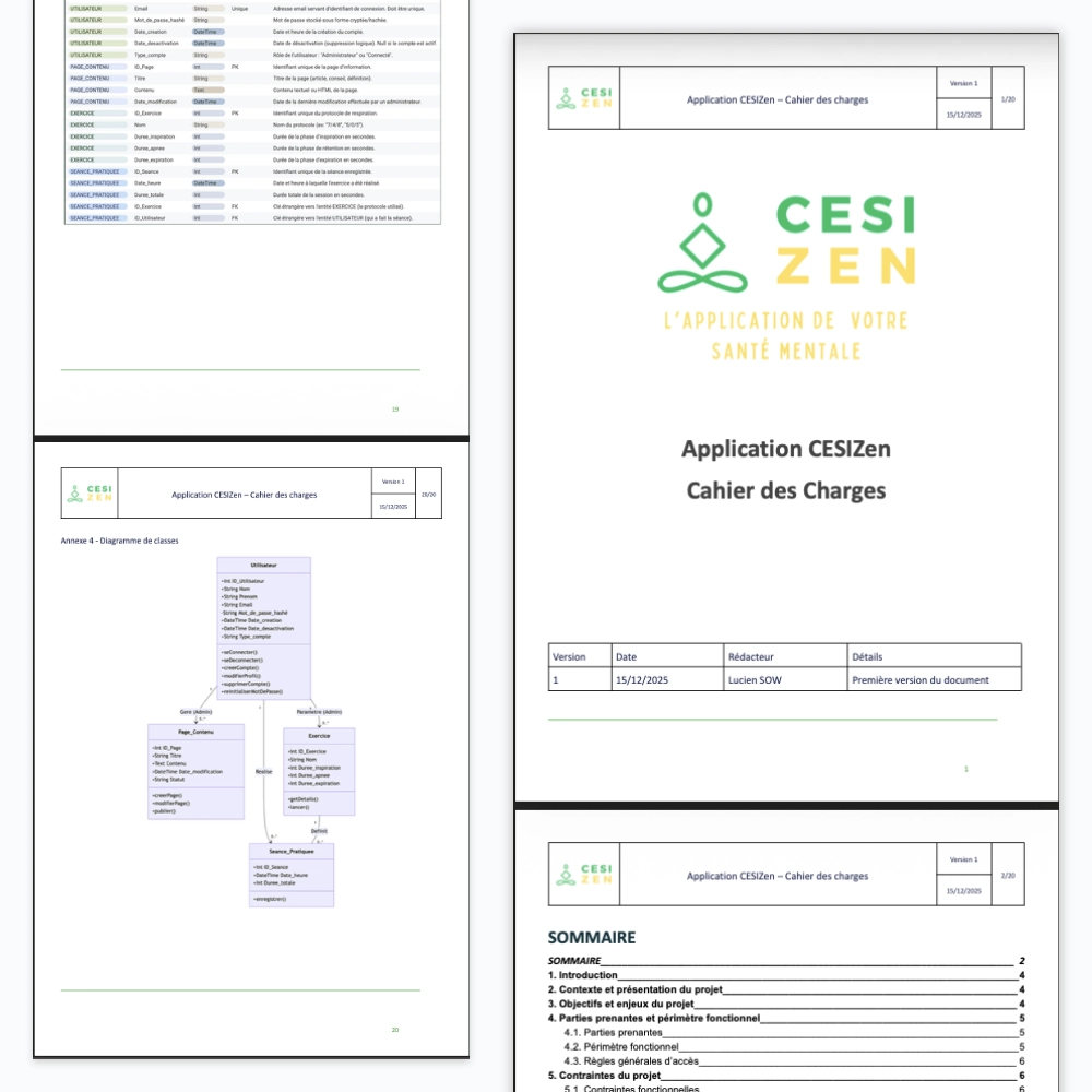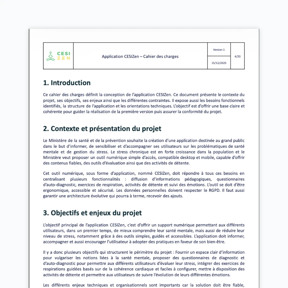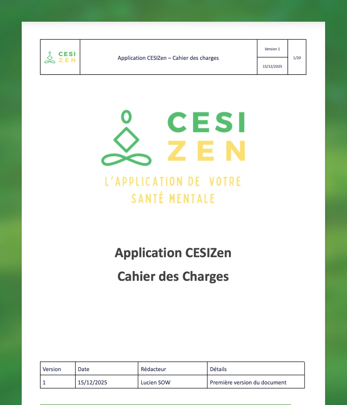 Le projet consiste à concevoir et développer CESIZen, une application dédiée à la santé mentale et à la gestion du stress pour le grand public. L'étudiant doit réaliser un prototype fonctionnel incluant obligatoirement la gestion des comptes utilisateurs et un module d'information, tout en choisissant un module complémentaire parmi des outils de diagnostic, des exercices de respiration, des activités de détente ou un tracker d'émotions.